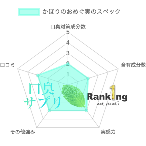 - 『かほりのおめぐ実』に配合されている口臭対策成分数は、シャンピニオンエキスや乳酸菌など6種類と口内には作用しないこともあって少なめです。